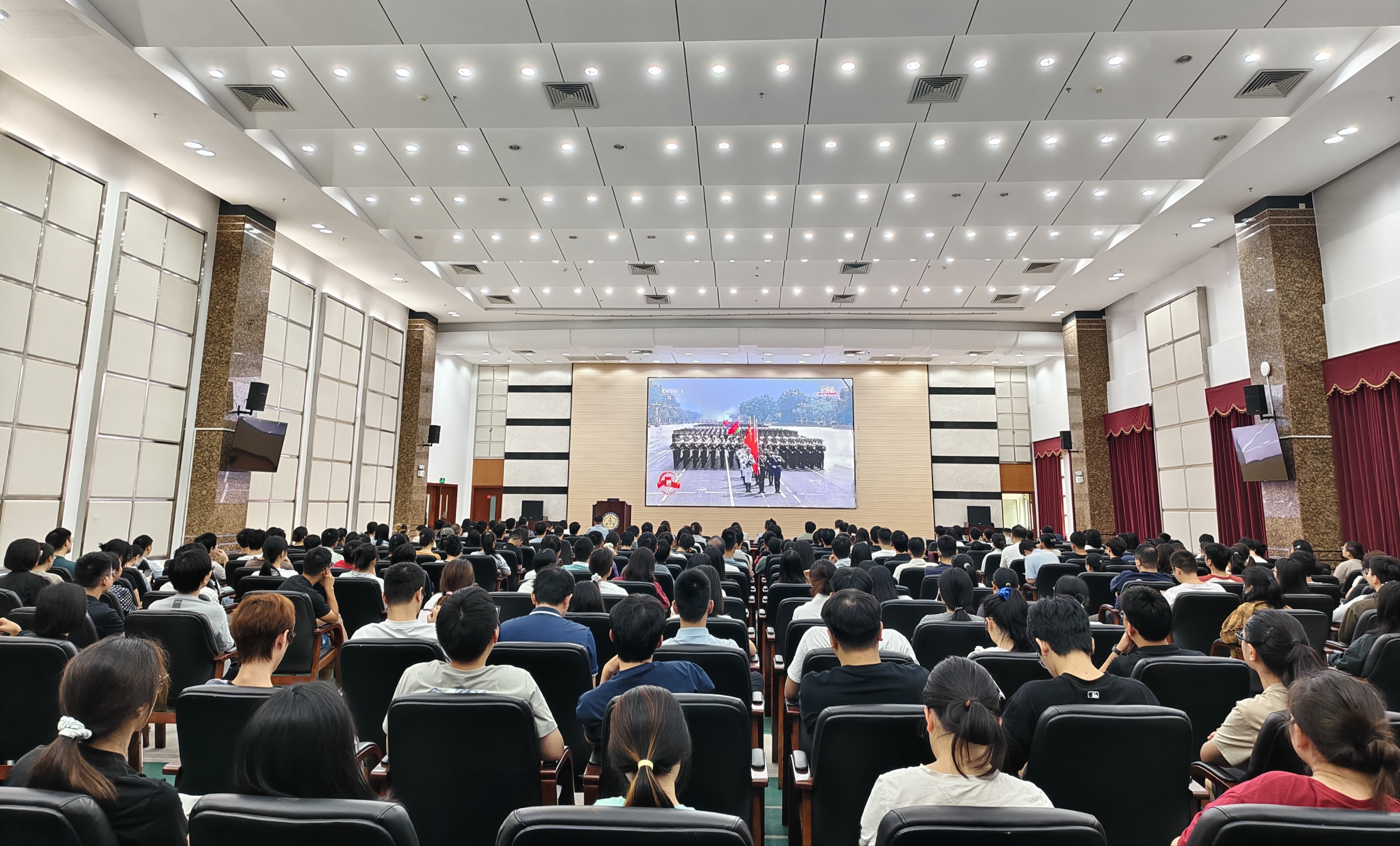 觀看現(xiàn)場座無虛席。大會伊始,全體人員肅立,行注目禮,高唱國歌,氣氛莊嚴(yán)肅穆。習(xí)近平總書記的重要講話深刻回顧了抗戰(zhàn)歷史,強調(diào)了偉大抗戰(zhàn)精神的時代意義,令人深思、催人奮進。隨后的徒步方隊、戰(zhàn)旗方隊、裝備方隊和空中梯隊依次亮相,展現(xiàn)出強大的國防力量,進一步激發(fā)了師生們的民族自豪感和愛國熱情。